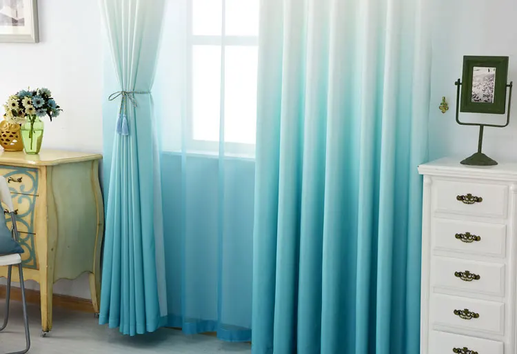 В интерьер с белыми стенами отлично впишутся и будут смотреться элегантно занавеси с градиентом в пастельных тонах.