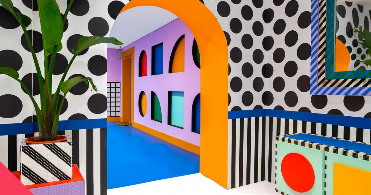 Магазин украшен различными диагональными зигзагами, точками, треугольниками и перекрещивающимися узорами в ярких оттенках пурпурного, желтого, бирюзового и оранжевого цветов — палитра, уникальная для дизайна Мемфиса. Вся комната от пола до потолка покрыта мемфисскими узорами и цветами, и нет ни одной поверхности, не затронутой ни цветом, ни узором.