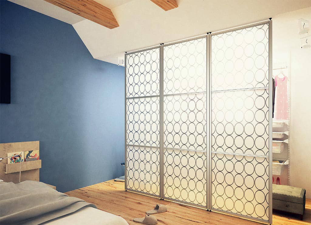 Ширмы визуально делят пространство, бывают складными или плоскими, обычно их не закрепляют в пространстве к стене или потолку, чаще к мебели. У плоских для повышения устойчивости предусмотрена система опор – ножки или колесики. Наборные модульные конструкторы чаще всего выполняются в каркасе, где стеклополотно фиксируется профилем, особо популярны раздвижные модели.