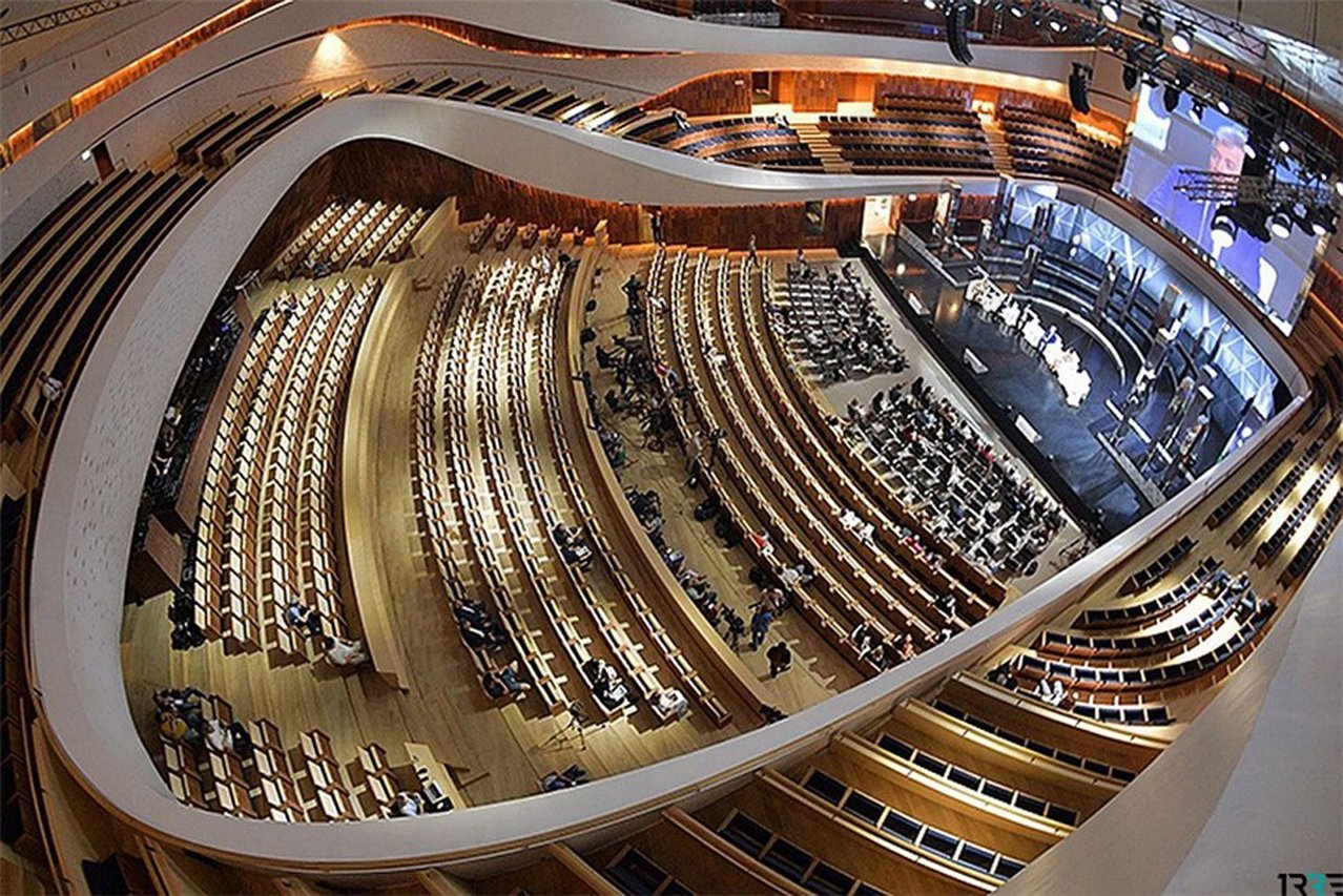Большой зал «Зарядья» восхищает не только своей уникальной архитектурной формой, но и своей возможностью трансформироваться: весь партер вместе со сценой превращается в плоский сценический пол, а сцена — в амфитеатр.