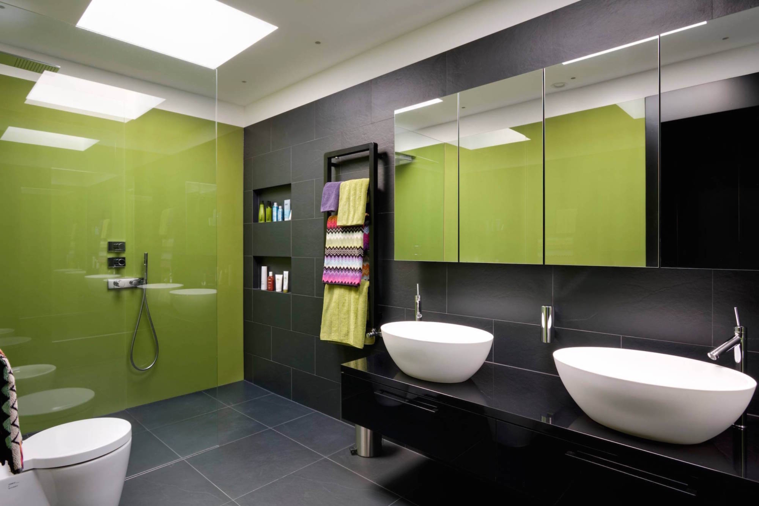 Зеленый пол и ярко-зеленая краска на стенах этой ванной комнаты создают еще более захватывающие ощущения от пребывания в этой зоне.